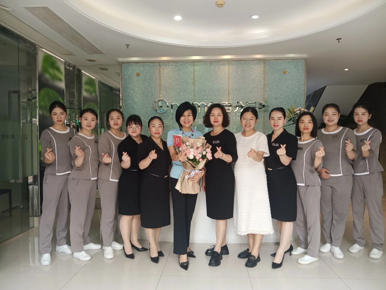 赵婕湄(左6)和黄艳萍(右5)和百分完美部分美容师团队